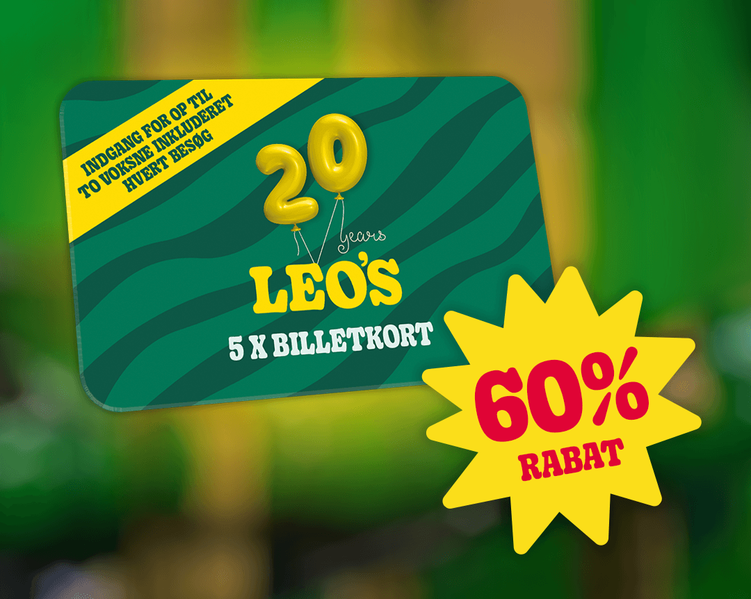 Velkommen til Leos jungle og opdag alle vores spændende attraktioner. Køb din billet her for at sikre en fantastisk oplevelse i vores legelande. Vælg den dato og tid, der passer dig, udfyld dine oplysninger og betal nemt online. Og hey, glem ikke at du kan afholde dit barns fødselsdagsfest hos os!